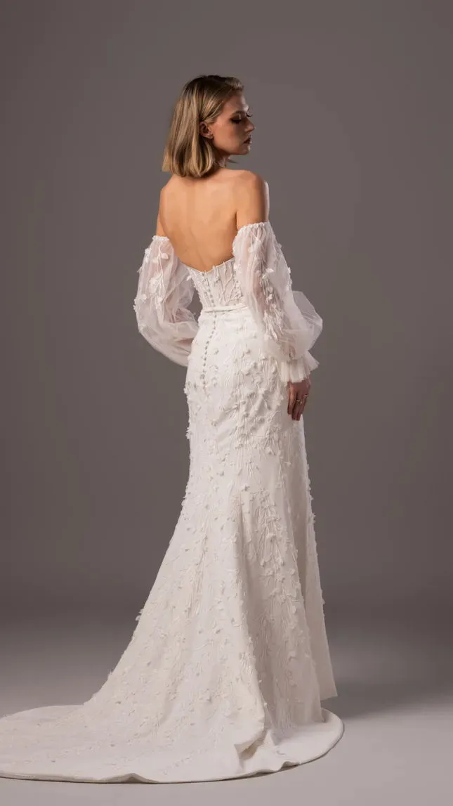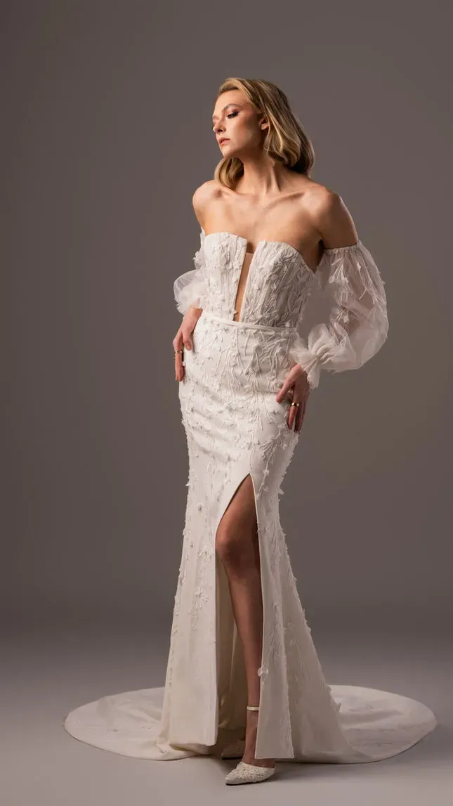 Details:3D Floral Appliqués, Exposed Boning, Sequins