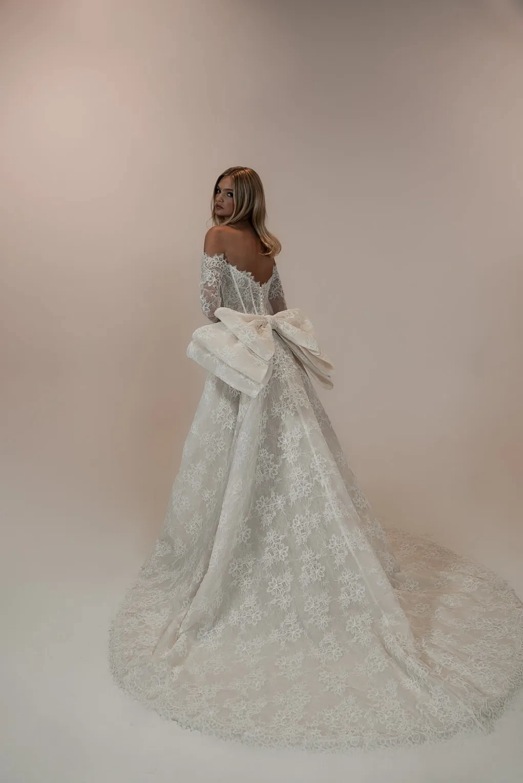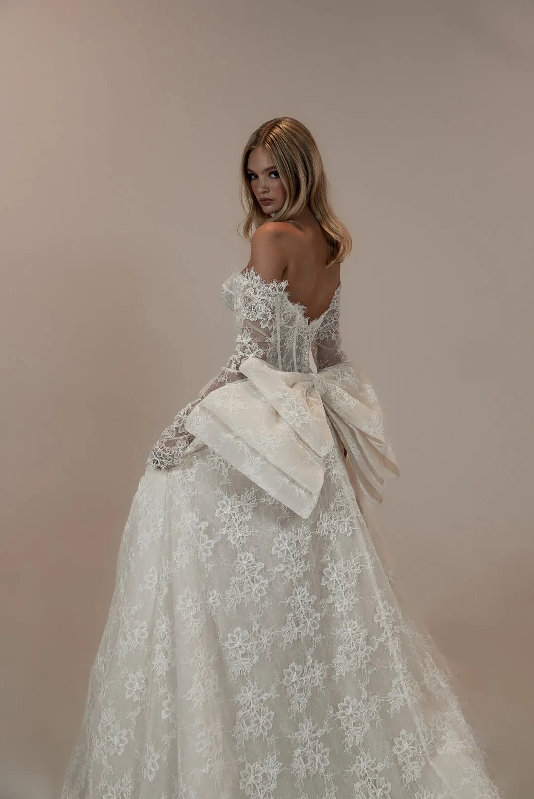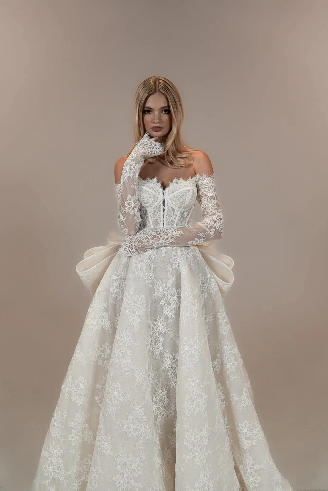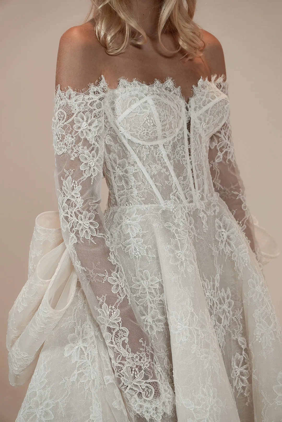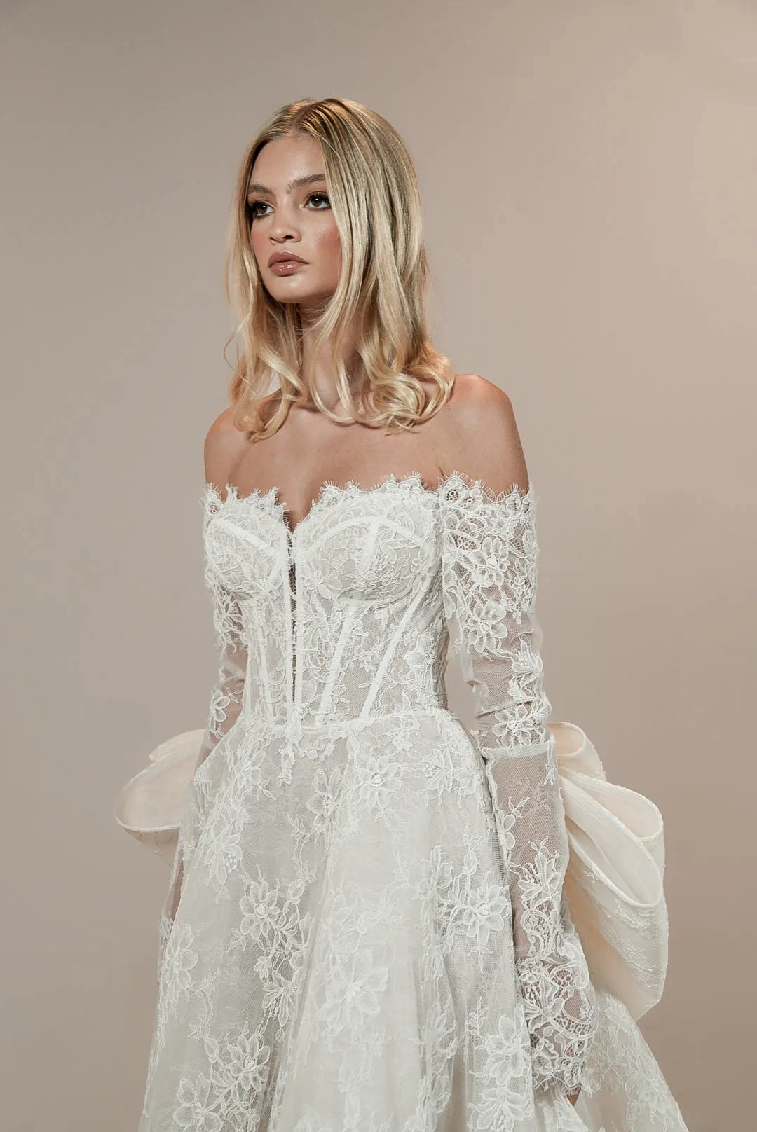 Lace ballgown with off the shoulder detachable fitted sleeves and a detachable lace bow