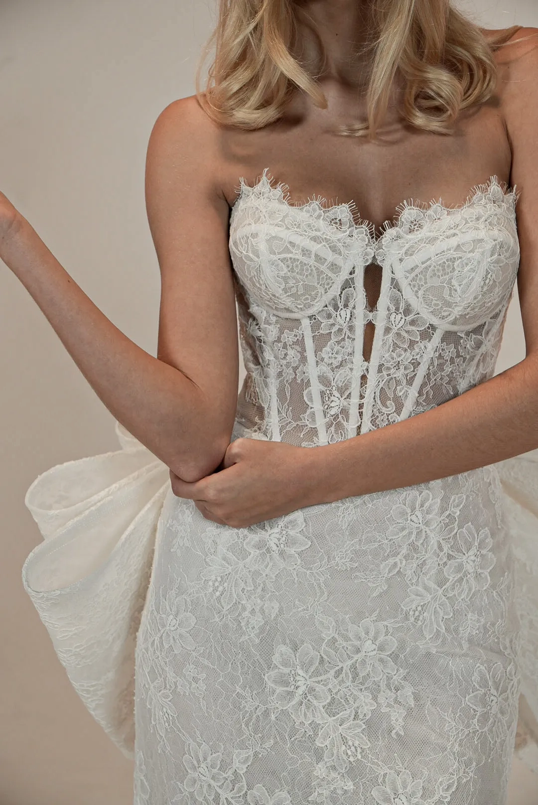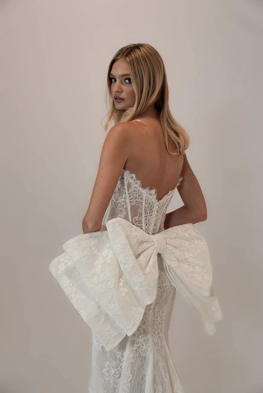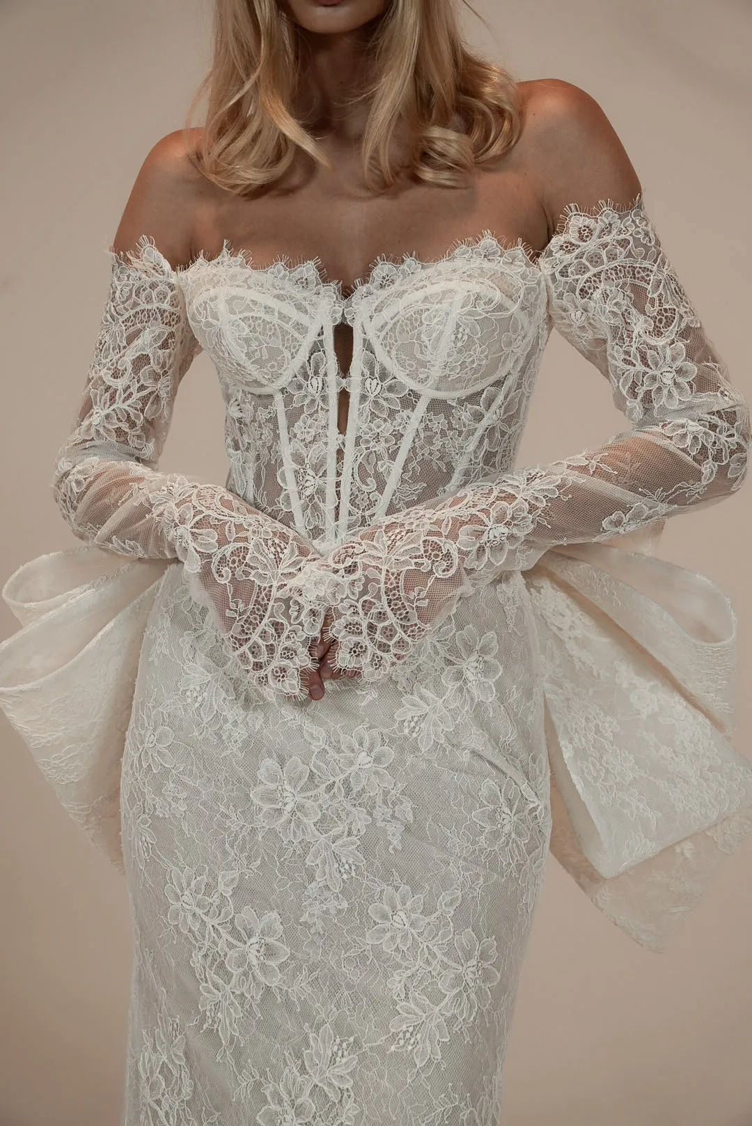 Lace fitted gown with off the shoulder detachable fitted sleeves and a detachable lace bow