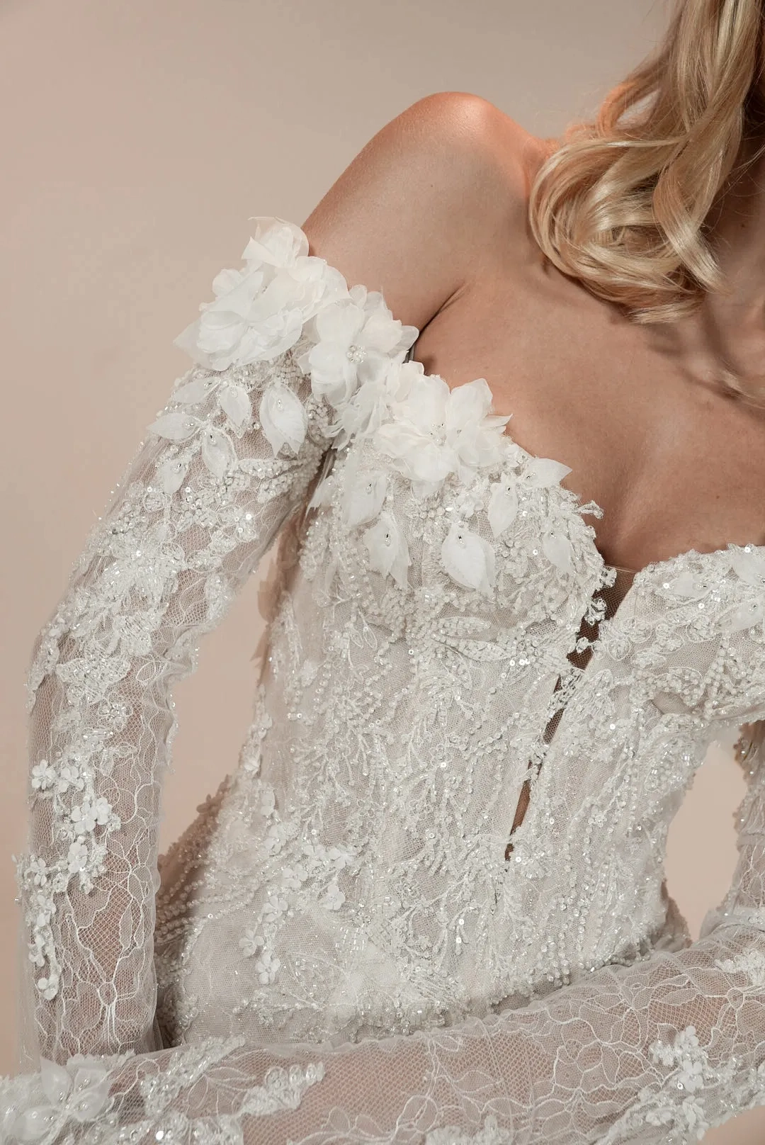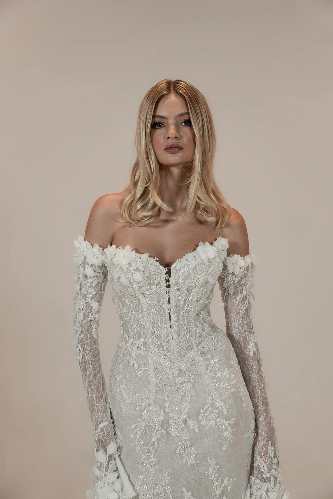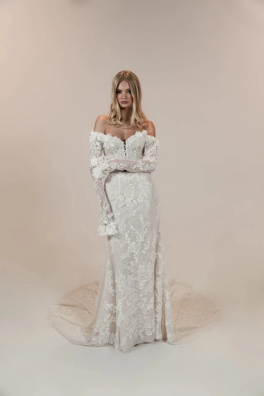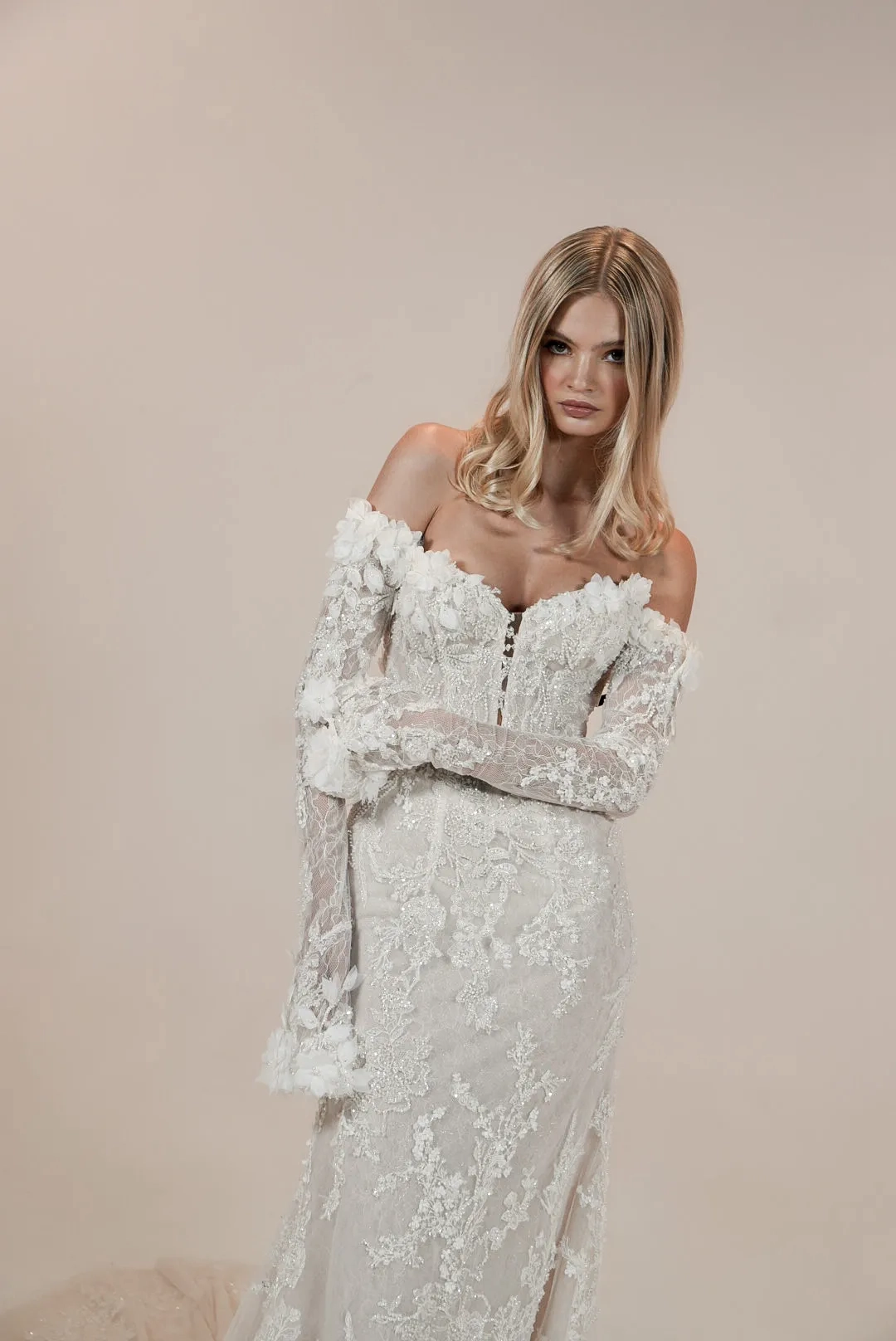 Lace fitted gown with floral detailing and off the shoulder detachable fitted long lace sleeves