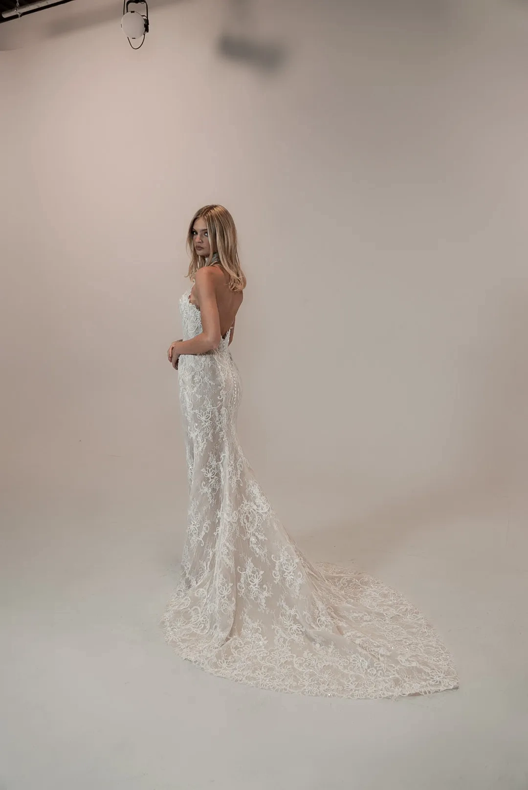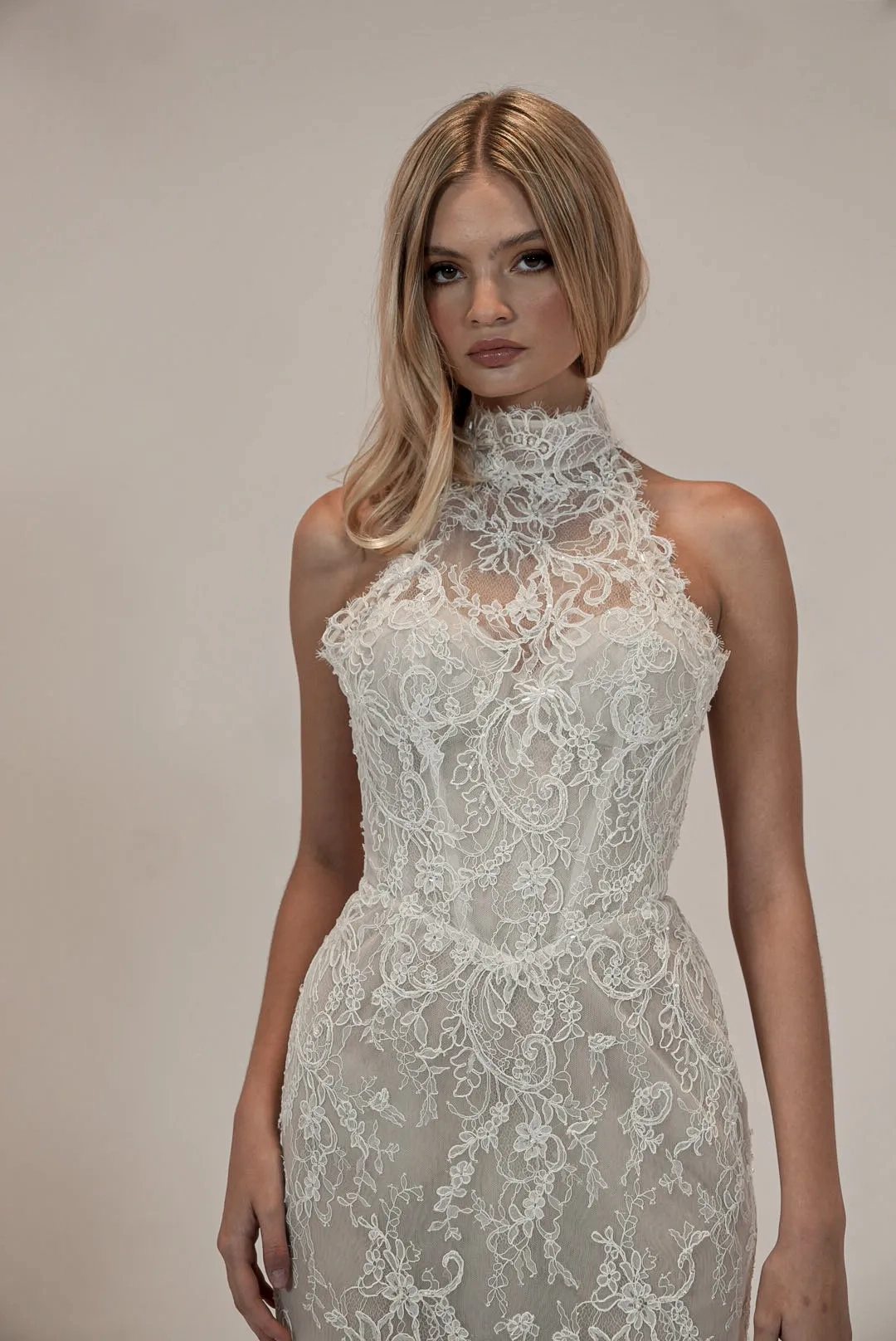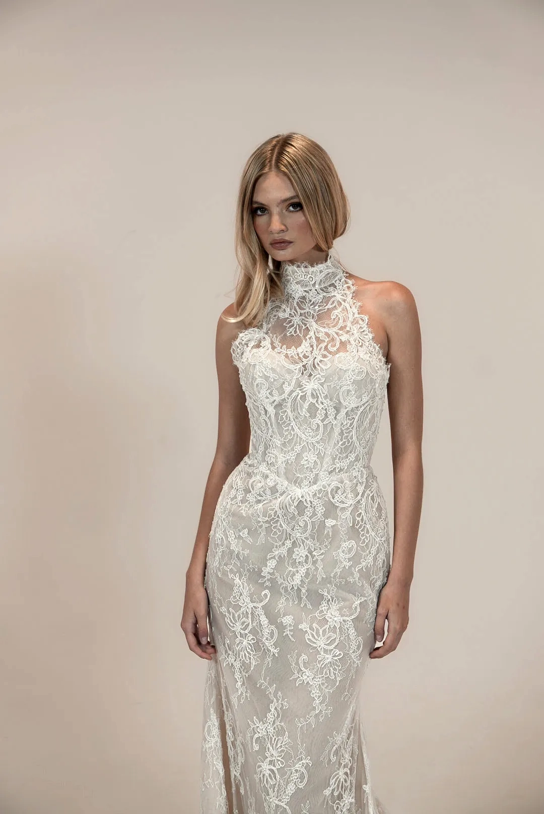 Lace fitted gown with a halter neckline and a lined sweetheart bodice