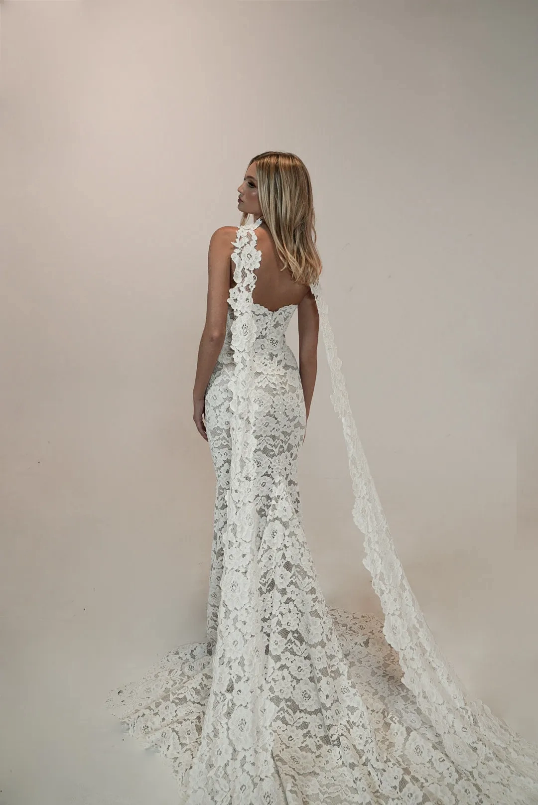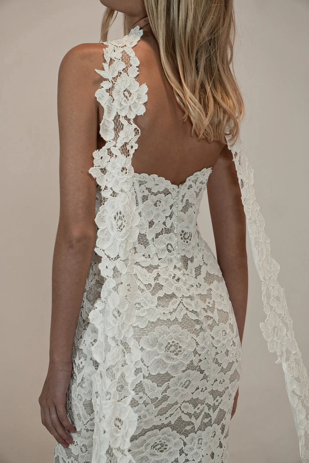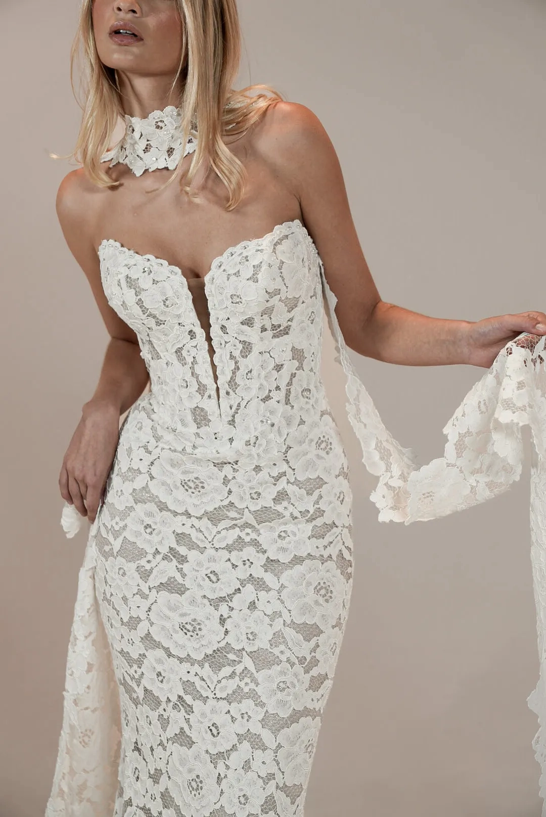 Strapless lace fitted gown with a plunge sweetheart neckline, removable fitted lace sleeves, and a lace neck scarf