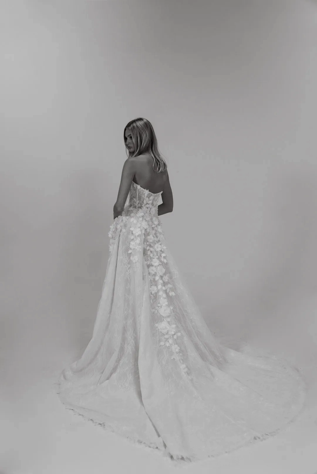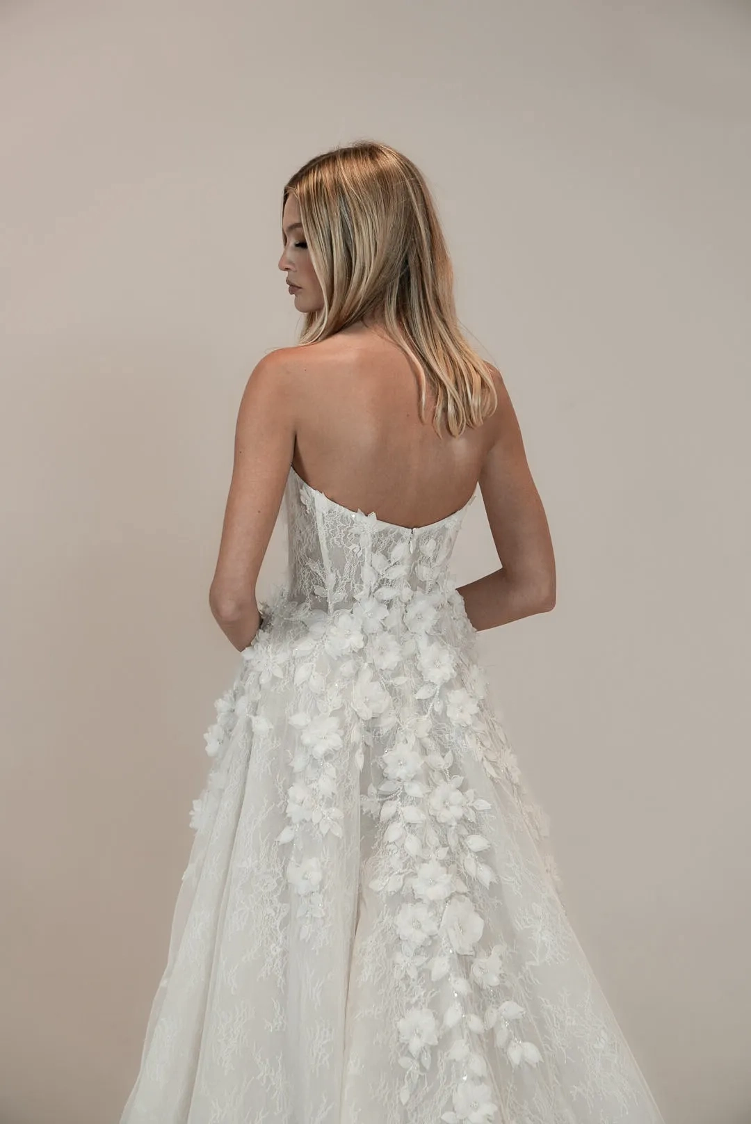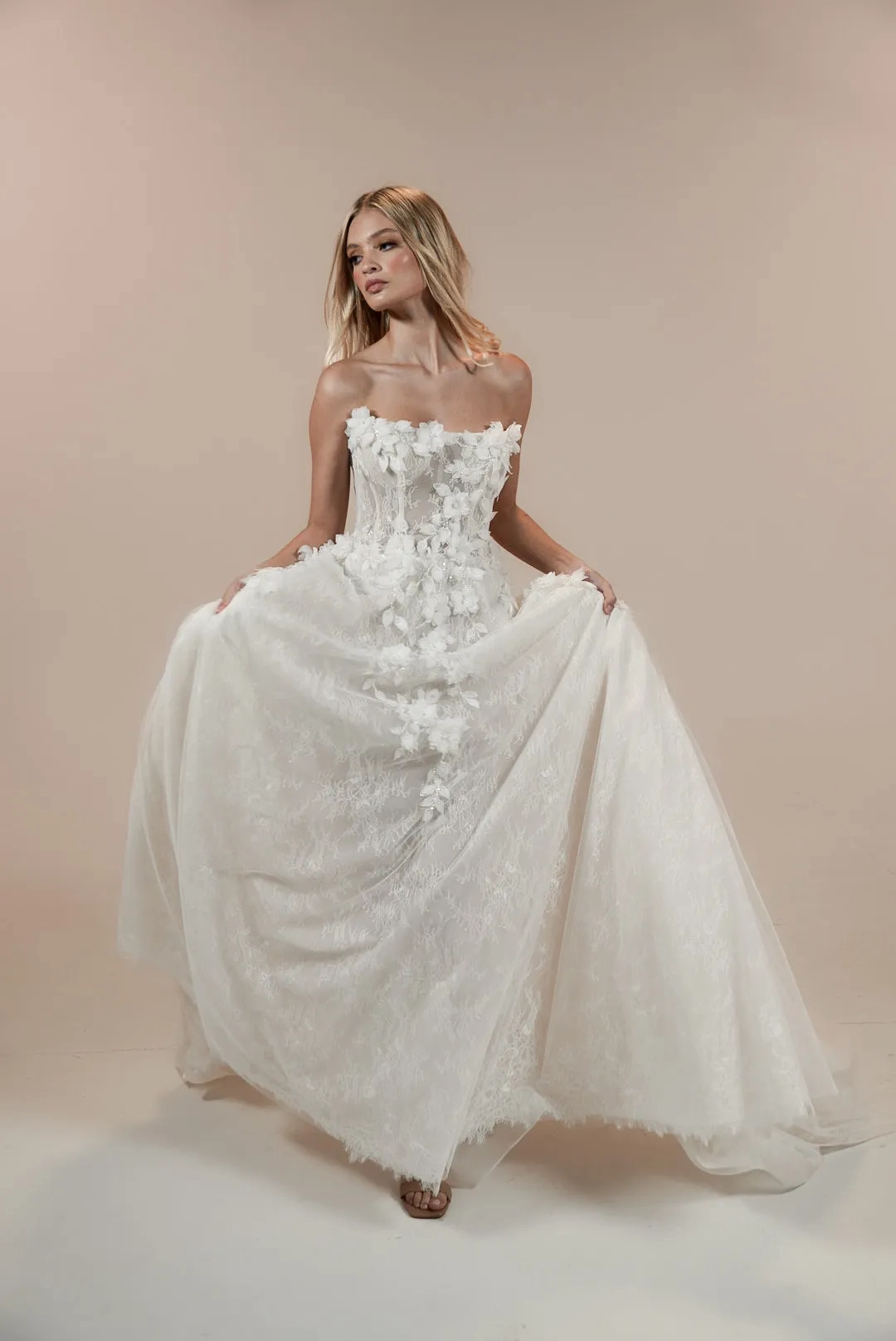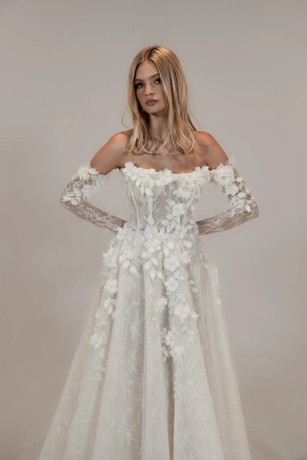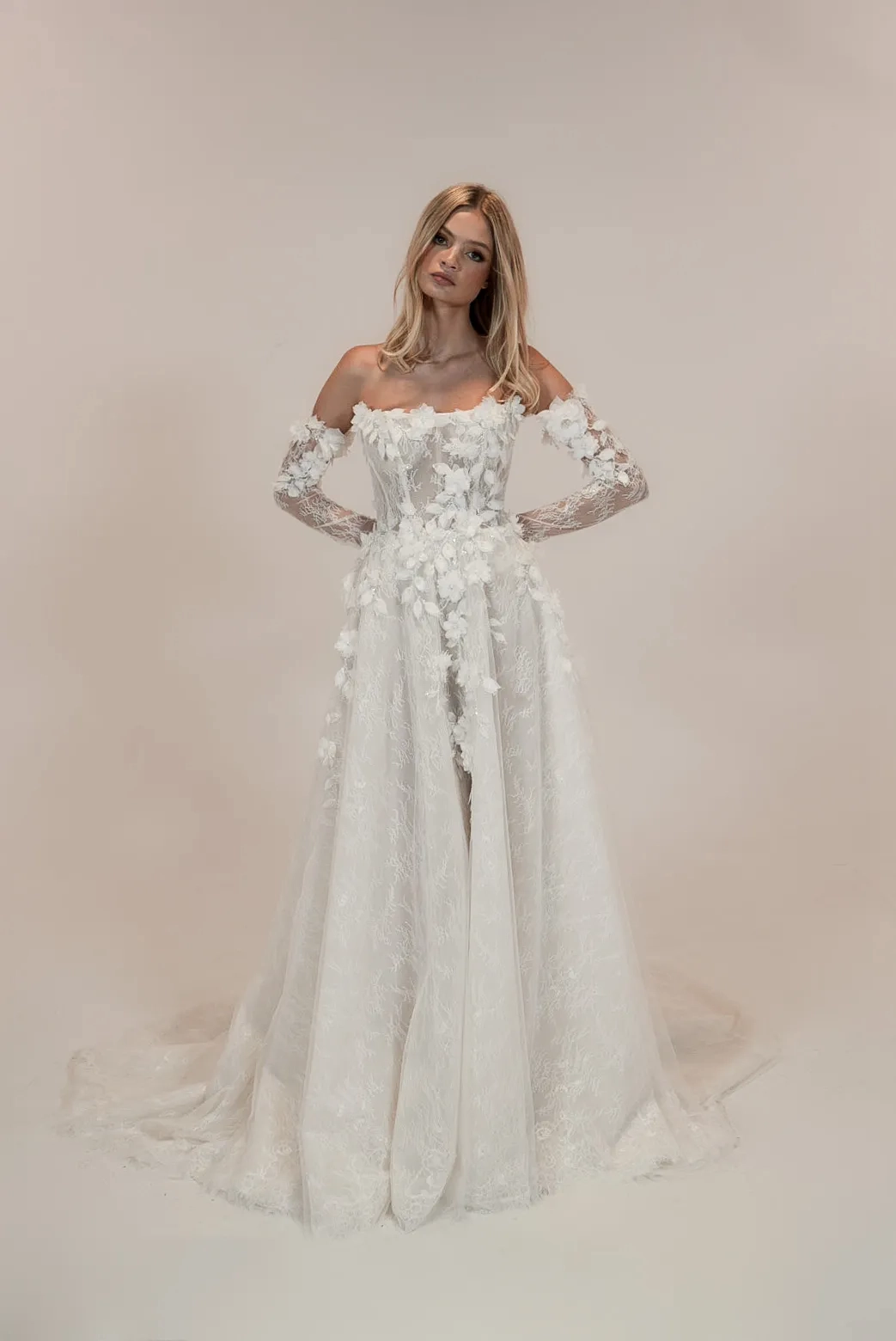 Strapless lace aline gown with a straight across neckline and removable fitted lace sleeves