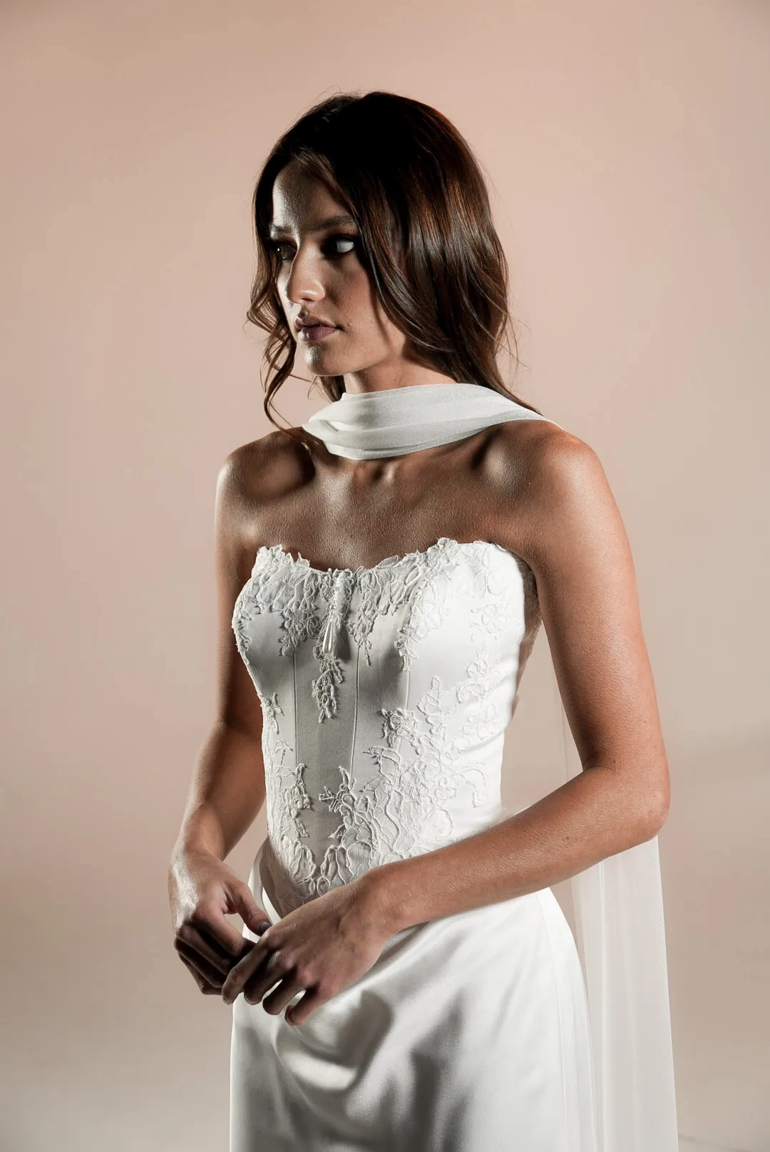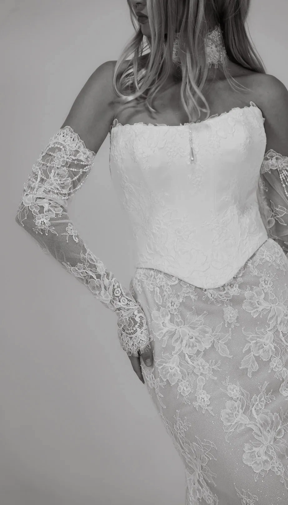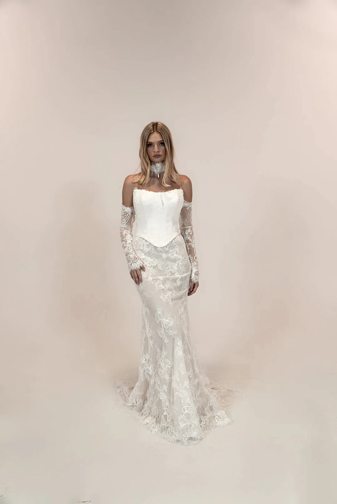 Strapless lace fitted gown with a removable corset, removable fitted lace sleeves and a lace choker
