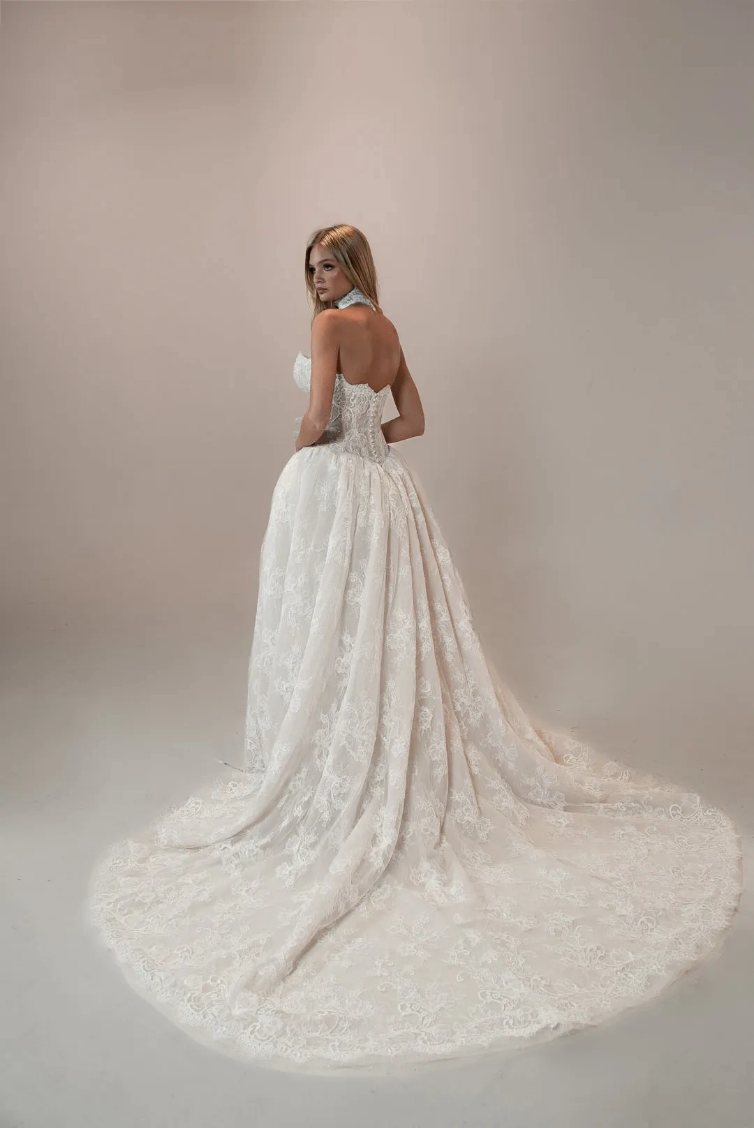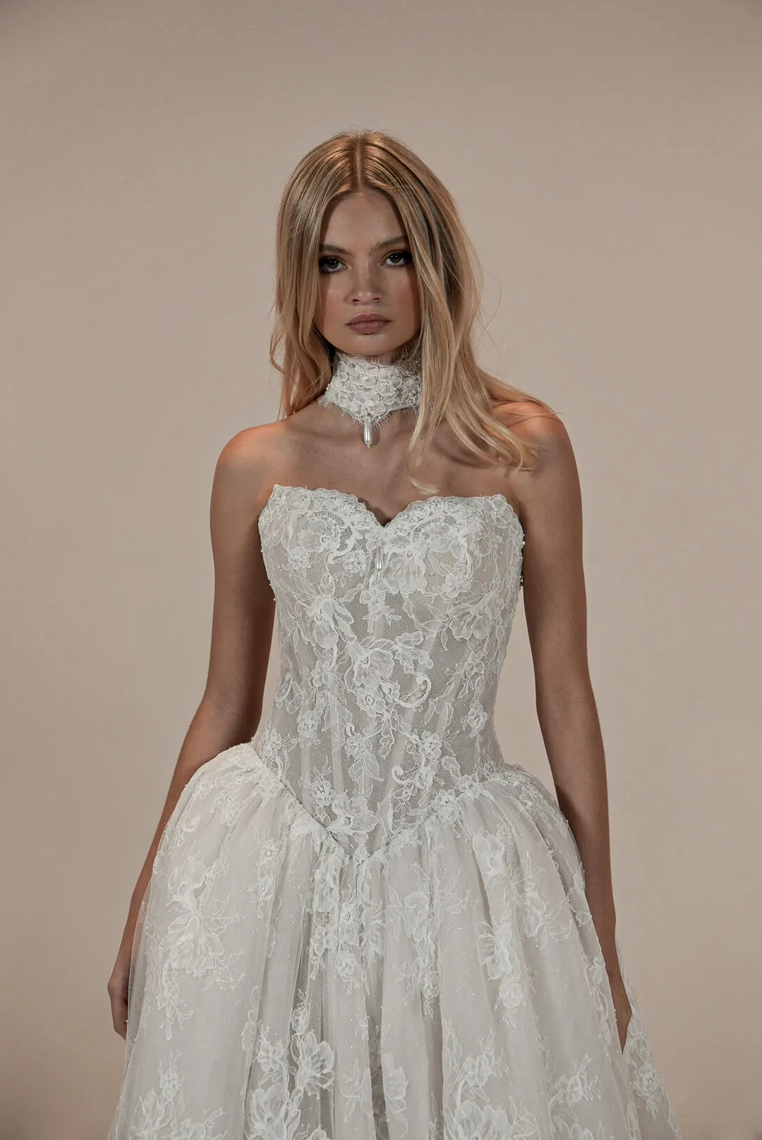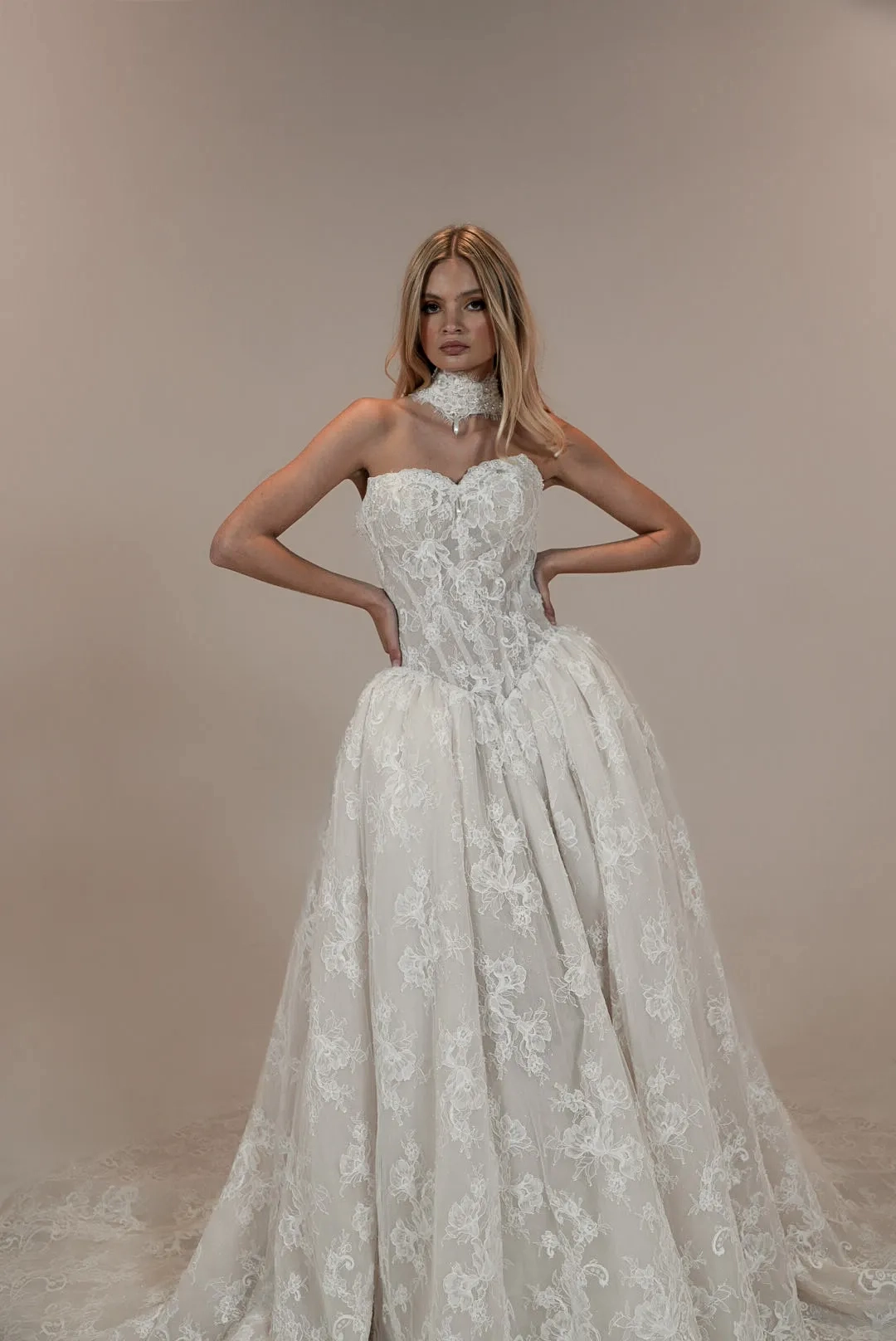 Strapless lace ballgown with a sweetheart neckline, lace choker, and a detachable lace bow