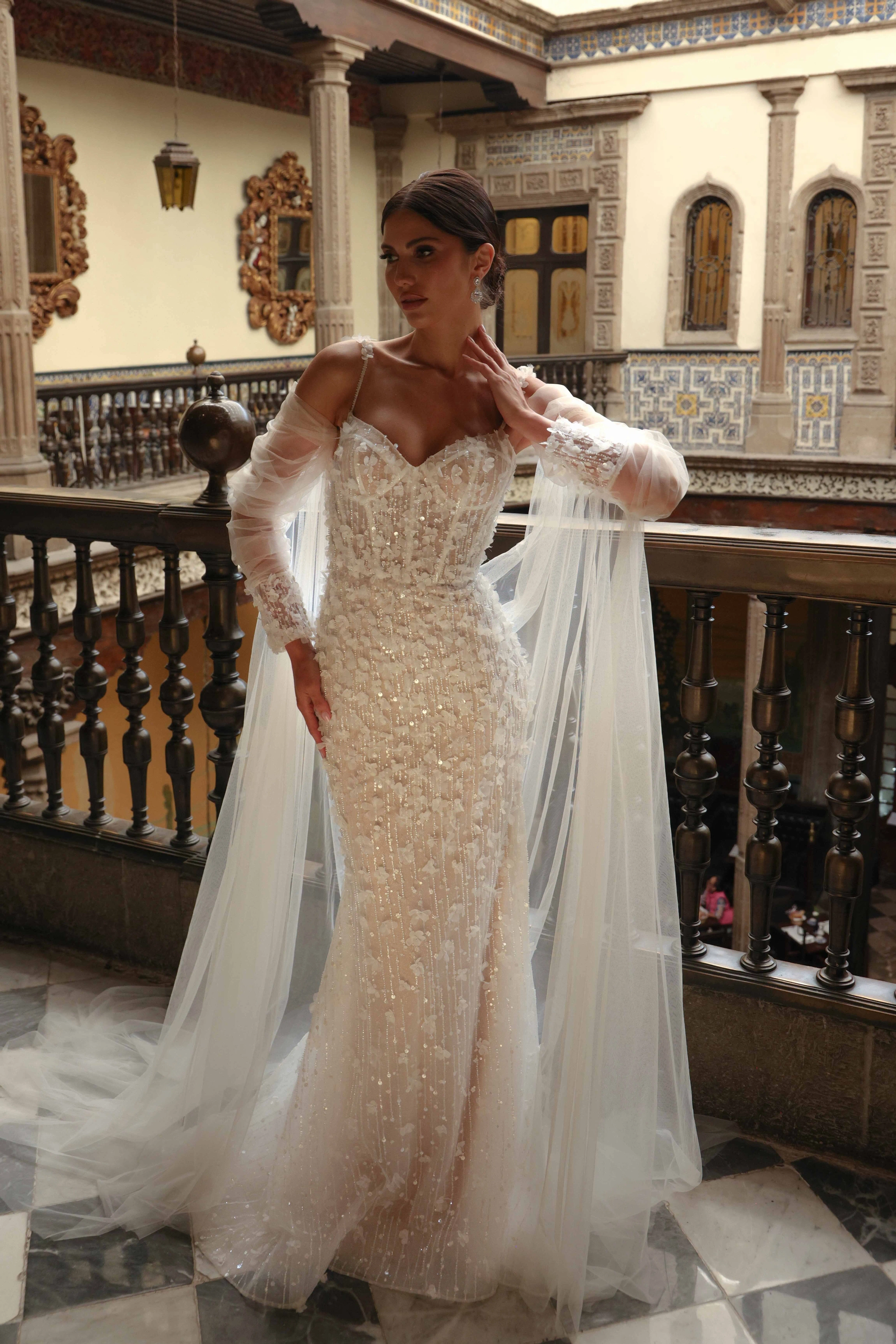 Details:3D Floral Appliqués, Exposed Boning, Sequins