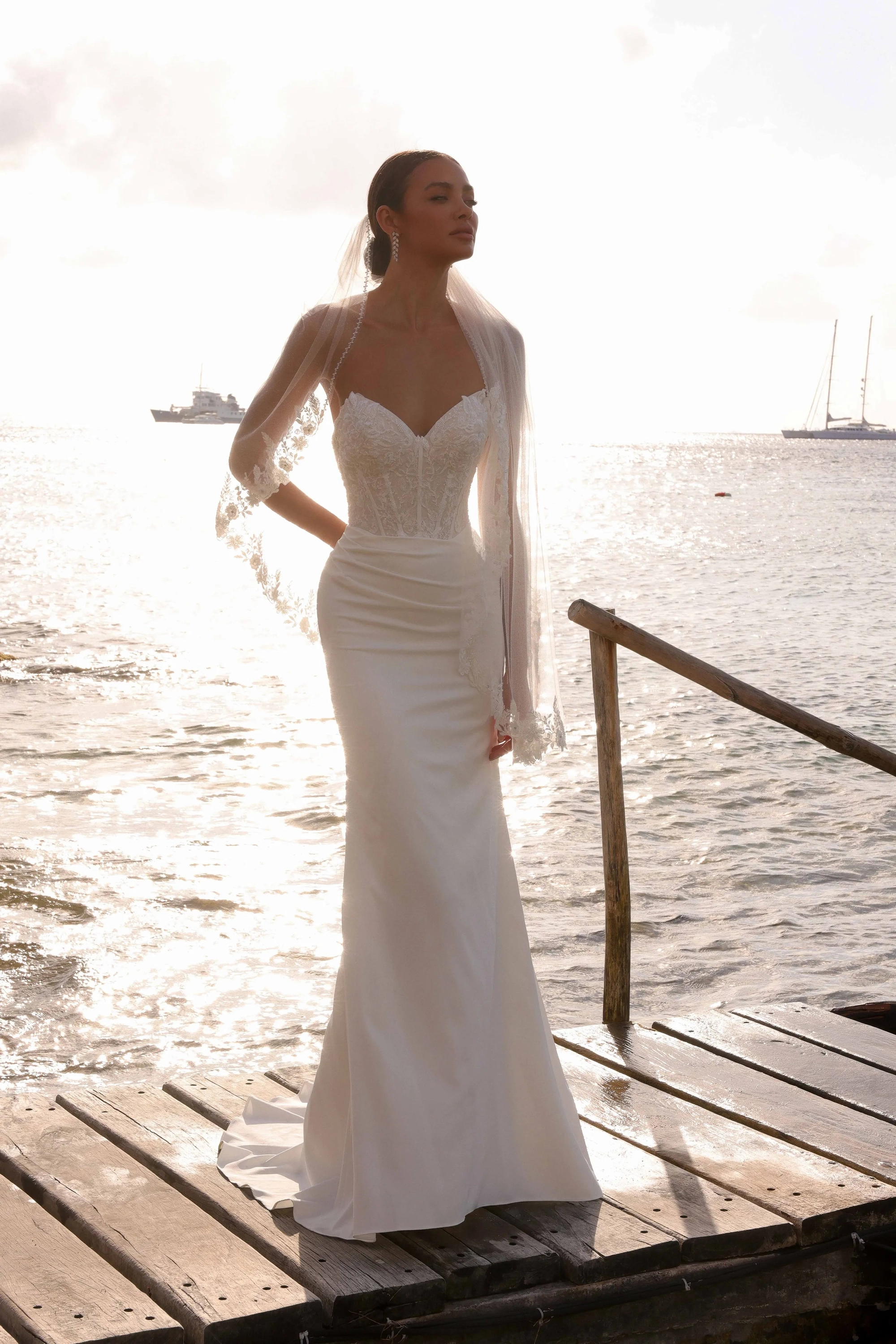 Details:Corset Bodice, Exposed Boning, Floral Appliqués, Rouched